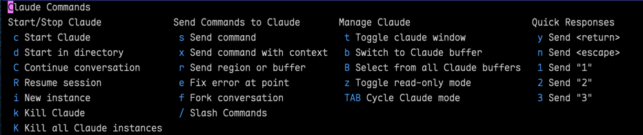 You can see a menu of the important commands by invoking the transient, claude-code-transient (C-c c m):
